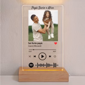 La lampada con foto spotify papà ha una base in legno illuminata da una striscia led, e una targa in plexiglass trasparente. La base in legno viene incisa tramite tecnologia di taglio laser, mentre la lastra in plexiglass viene stampata tramite tecnologia di stampa UV.