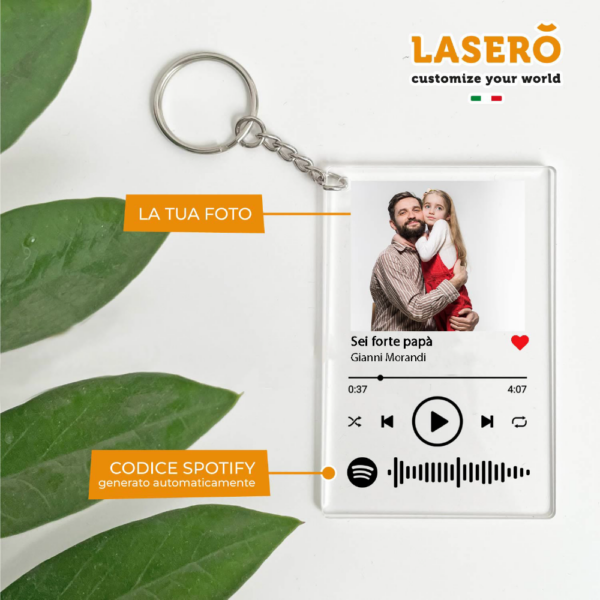 La Magia della Musica: Oltre alla foto personalizzata, il portachiavi personalizzato spotify include il codice Spotify della canzone “Sei Forte Papà” di Gianni Morandi. Basta scannerizzare il codice con lo smartphone e lasciarsi trasportare dalle dolci note di questa canzone, che celebra il rapporto unico e speciale tra padre e figlio/a.