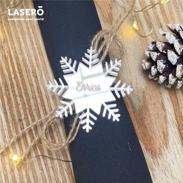 Segnaposto Natale Personalizzati con Nome: scegli il fiocco di Neve come segnaposto per il tuo cenone di Natale, e scegli se realizzarlo in legno, o in plexiglass di diversi colori.